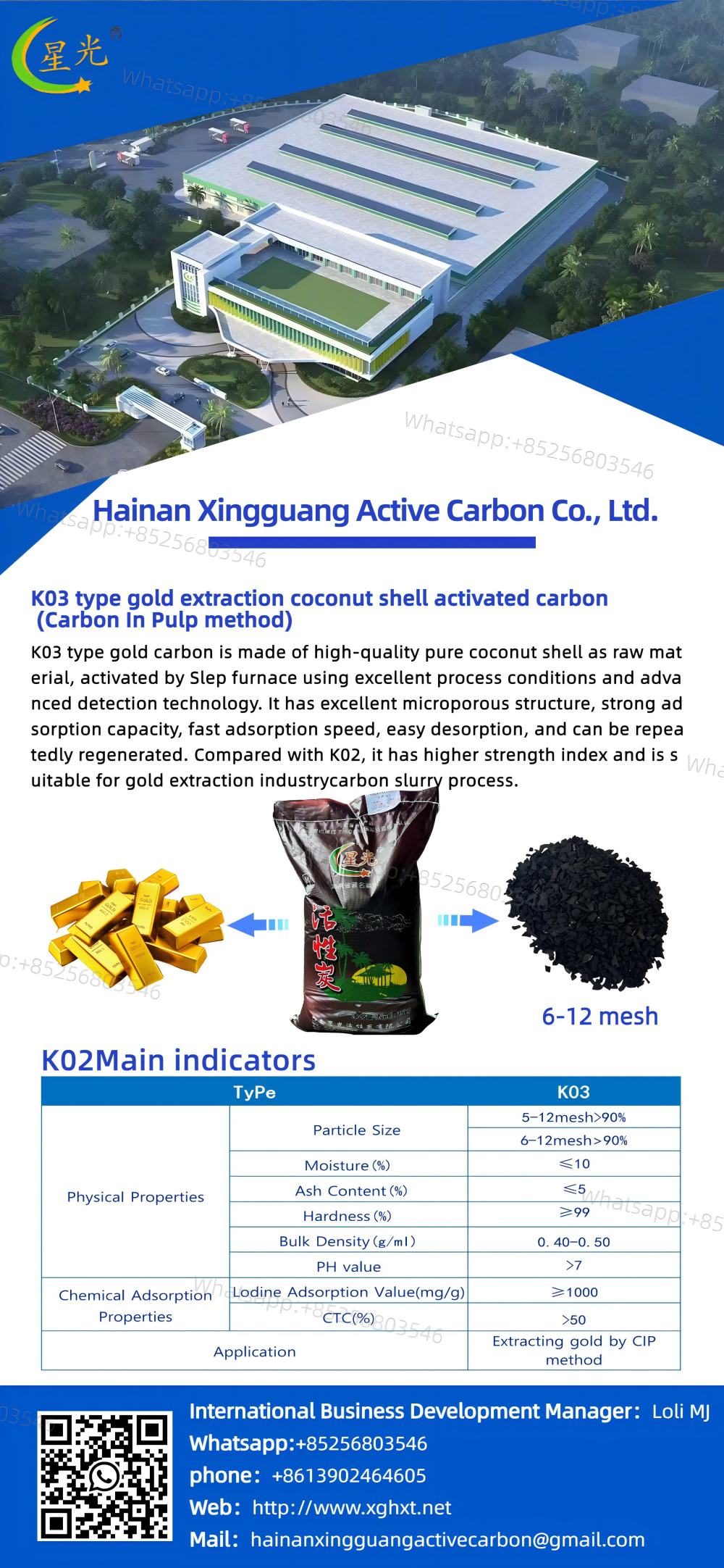 K03 Type coconut shell based activated carbon for gold extraction ,made of original coconut shell, is activated in SLEP activation furnace with optimum technological conditions and the most advanced testing method. The product has the features of highly developed pore structure, large specific surface area, good hardness, excellent adsorption capacity, absorption speed, easy desorption,repeated regeneration etc. It is mainly used in extracting gold by CIP (carbon-in-pulp) method.